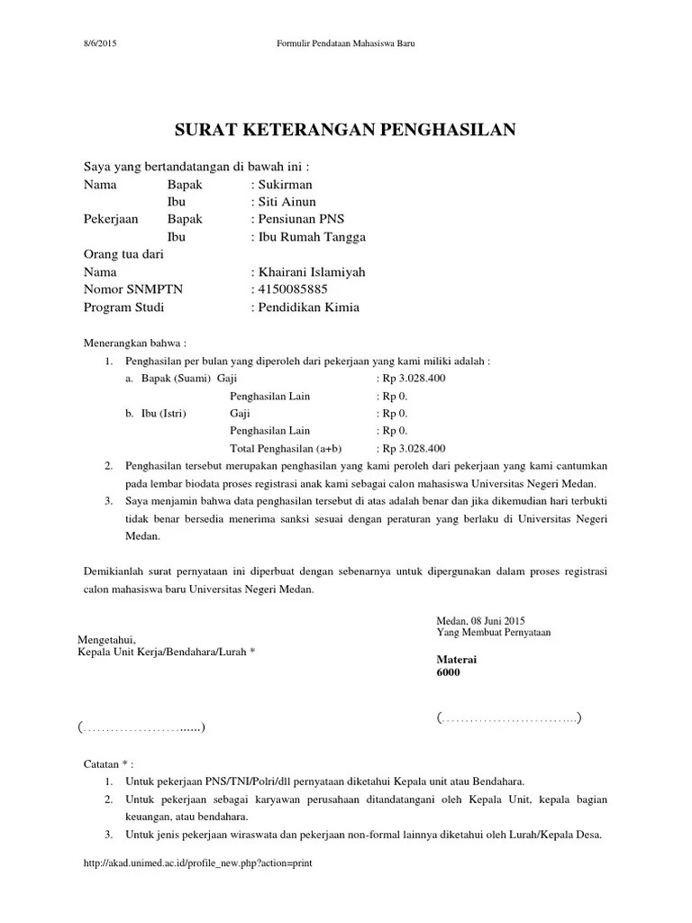 Menjadi tanggungan saya penuh dan tidak mempunyai penghasilan sendiri. Fotocopy surat keterangan penghasilan suami (1 lembar diberi materai . Penghasilan suami/istri per bulan : Fotocopy surat pernyataan bersedia dimadu (dari istri pertama dan calon istri. Penghasilan/gaji suami dan istri dijadikan satu dalam format pdf dengan. Surat keterangan tidak memiliki rumah. Saya yang bertanda tangan di bawah ini: Yang bertanda tangan dibawah ini. Surat pernyataan penghasilan orang tua. Demikianlah surat pernyataan ini diperbuat dengan sebenarnya untuk dipergunakan . Contoh i slip/surat keterangan penghasilan guru pns. Surat keterangan ini diberikan untuk melengkapi persyaratan administrasi. Surat keterangan penghasilan dari tempat bekerja cota.